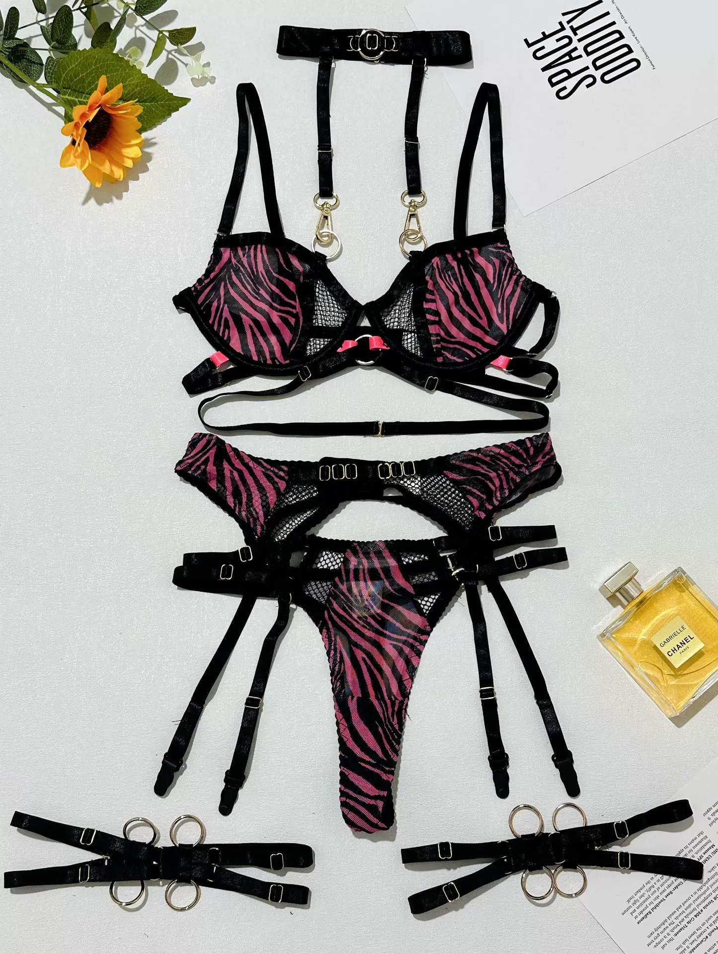 2. Introduction:Unleash your wild side with this daring 3-piece zebra print lingerie set. Bold in both color and design, the set includes a molded underwire bra with harness straps, a matching high-waisted mesh thong, and a seductive garter belt adorned with O-ring and metal buckle details. Complete with a statement choker for the ultimate dominant edge, this outfit is made for bold women who love to own the night.