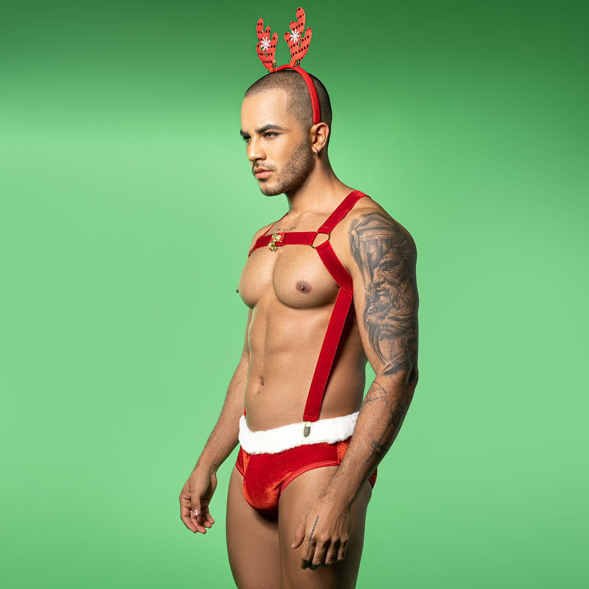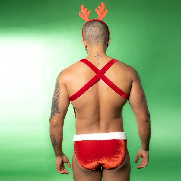 2. Introduction:Unwrap the holiday spirit with this Men’s Christmas Reindeer Lingerie Costume, designed to elevate your festive celebrations with a sexy, playful twist. This outfit combines vibrant Christmas elements with a bold, body-enhancing silhouette—perfect for anyone who loves seasonal fun with a daring edge.Crafted from high-quality velvet fabric, the suspender harness design emphasizes the shoulders, chest, and torso, creating a confident and sculpted look. The contoured pouch provides comfort while shaping and supporting, enhanced by a soft faux-fur trim that adds a classic holiday touch.Whether worn for Christmas parties, themed events, couple’s roleplay, or festive photo shoots, this fun and seductive men’s lingerie set brings laughter, excitement, and irresistible holiday charm to any occasion. A perfect gift choice to heat up the cold winter nights!