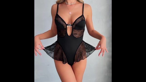 2. Introduction:This seductive black bodysuit blends soft mesh, delicate lace, and a flirty peplum-style design. The plunging neckline is accented with a silver heart charm, adding a sweet yet sultry detail. With sheer side panels and a figure-hugging silhouette, it’s the perfect outfit to captivate and enchant.