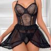 Sexy Black Lace Babydoll Lingerie with Sheer Mesh Skirt – Corset Style Bustier Sleepwear Set with Panty
