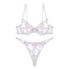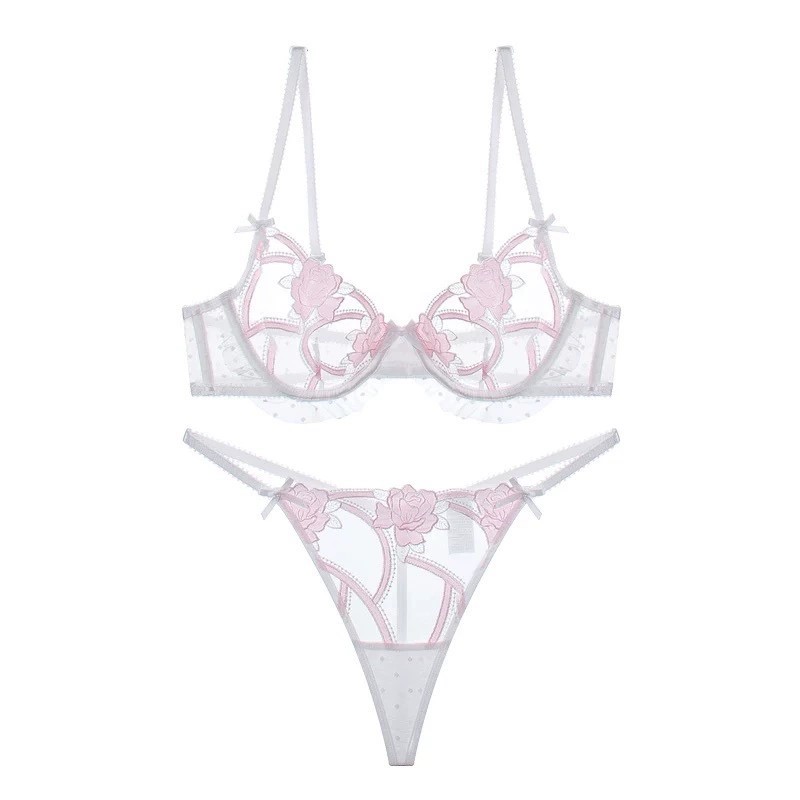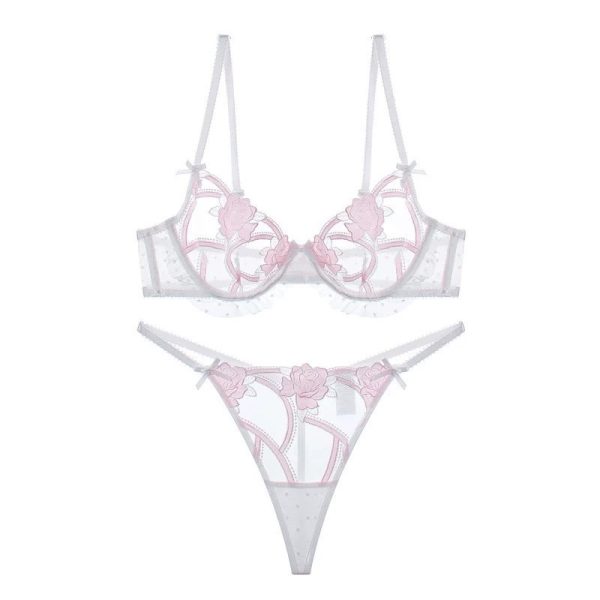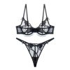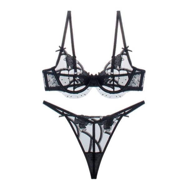 Sexy Floral Embroidered Lingerie Set for Women – Sheer Mesh Bra and Thong Panty with Ruffle Trim, Transparent Underwire Two Piece Intimate Set – JS5520