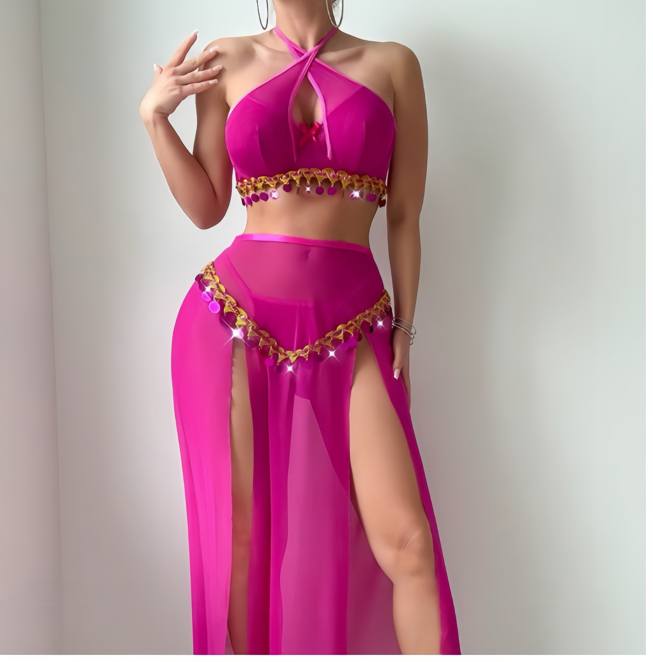 2. Introduction:Turn every entrance into a show-stopping performance with this vibrant belly dancer-inspired two-piece lingerie set. Crafted in bold hot pink with playful tassel accents and sheer chiffon slits, this outfit is a sultry blend of confidence and rhythm. The halter-style crisscross bra adds bold cleavage definition, while the high-slit mesh skirt flows with every step, leaving just enough to the imagination. Perfect for themed parties, stage performances, exotic photo shoots, or seductive nights in — this set is made to make you feel powerful, feminine, and unforgettable.